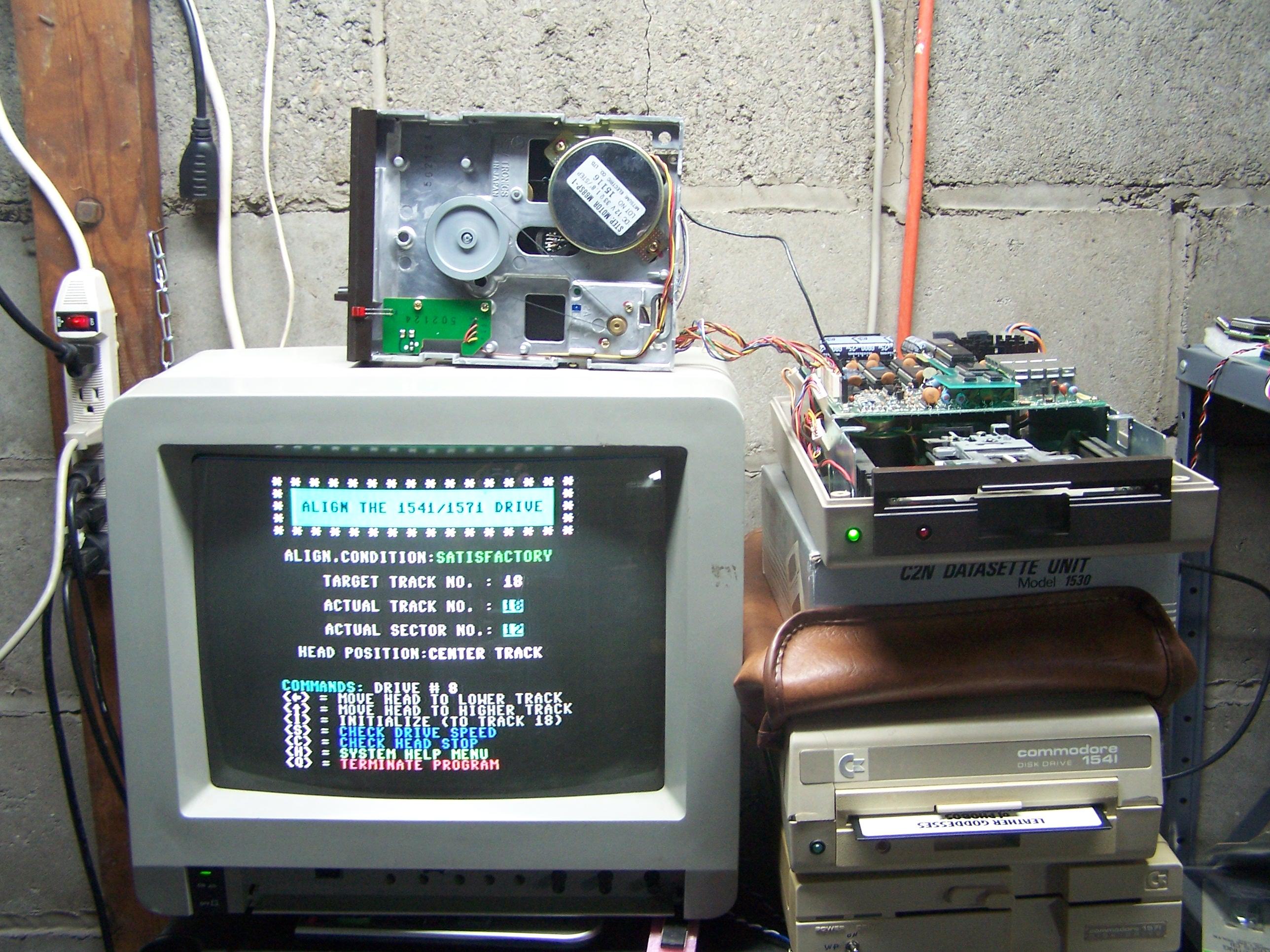 A guy on Lemon64 has a bad Newtronics drive mech. I had one in my parts box that was given to me so I pulled apart the nearest 1541 that I had to hook the drive to. I tried to load a disk of "Pool of Radiance" and "Wasteland" Neither would load in the drive mech BUT would load fine in another drive. I have never aligned a disk drive so I figure why the heck not give it a try. I have a copy of the "Free Spirit 1541/1571 drive alignment disk and software". I put the disk in and loaded the 1541 program from the disk, it loaded fine. After doing some tests the software said the drive needed an alignment. I read the info on doing this and started working at it. The screen says it's "Satisfactory/Needs alignment" it flashes between the two while telling what track it's on. You can see it in the picture below, well the Satisfactory anyways... I played around for almost 2 hours. This is one task that is trying my patience for sure. :) At the time of this entry, I was STILL trying to get the drive aligned... I'll update this entry IF I get this drive working.