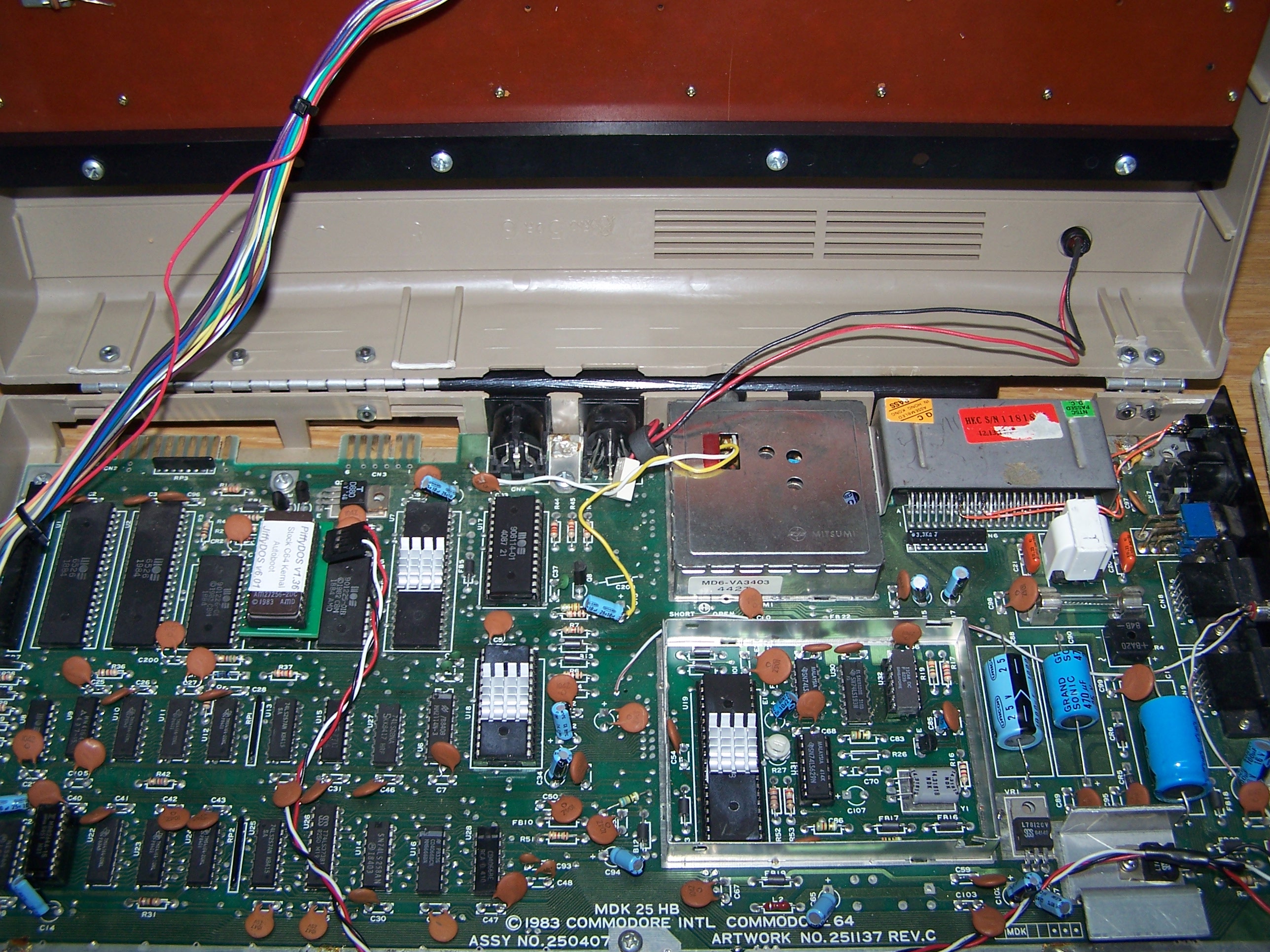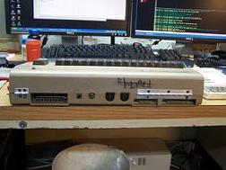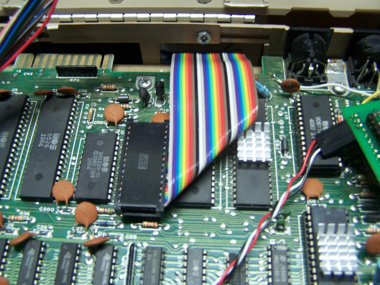 At the last ECCC show, I was talking to goog of PDXCUG about an idea of putting hinges on the back of a C64 so the top could be "flipped open" with out dealing with the screws all the time. I also talked to AgentFriday (the guy behind the 38.4k driver for the Comet64 internet modem.) about an external solderless breadboard hooked to the Kernel ROM socket inside the 64 using a ribbon cable with 28 pin IDC connectors on the end. I wanted to do the same thing BUT have the breadboard mounted on TOP of the 64 so what you see below is my latest project. The 64 looked like garbage already so I didn't mind drilling/cutting/melting it or what ever.