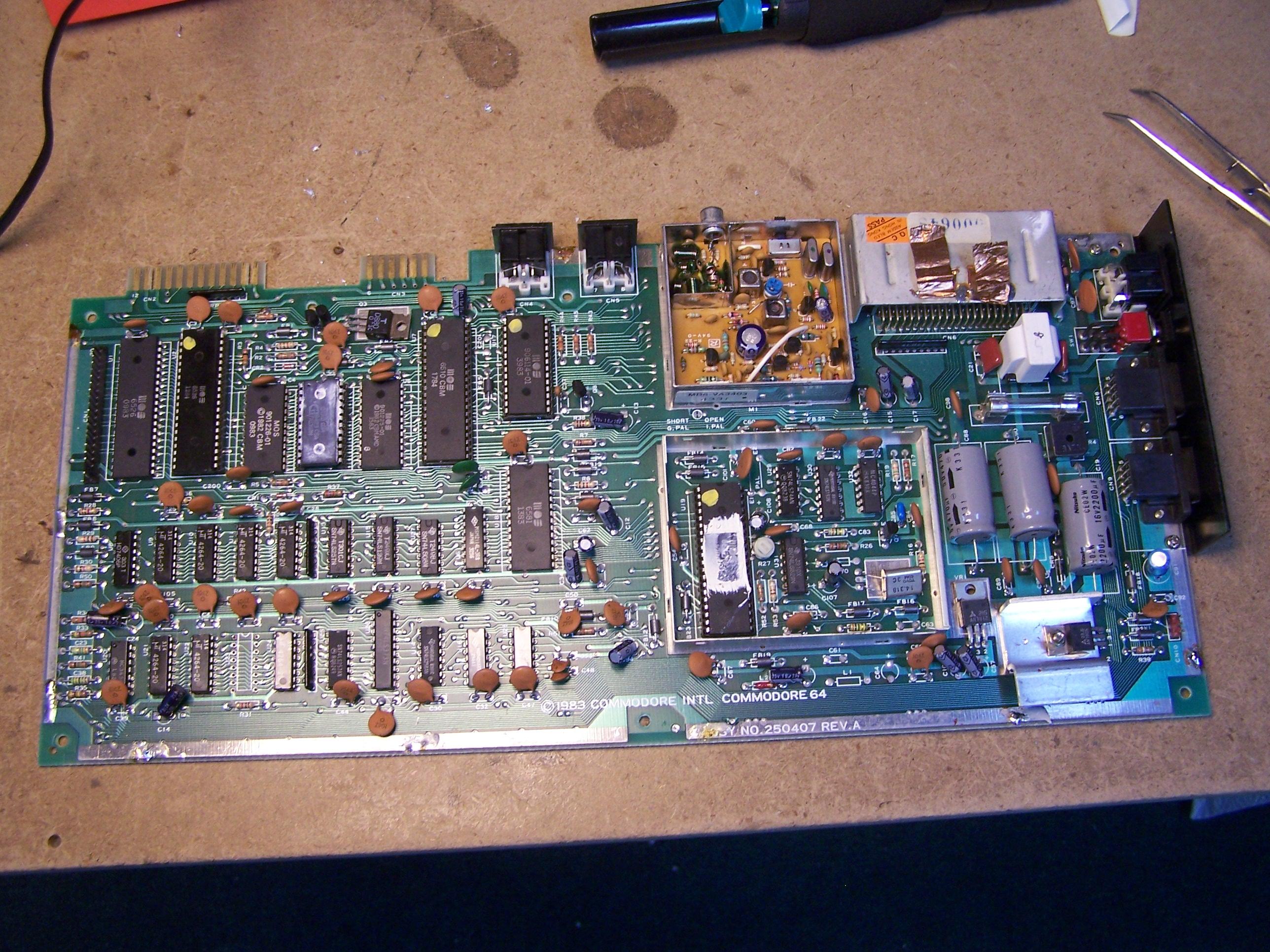 Just received a box of 7 - C64s, none working BUT I knew that when I got them, One board is a Rev A, I don't have any of those so I'm going to try to get it working. First thing I did was to do the "HEAT CHECK". I put power to it and left it on for about 15 minutes and started looking for HOT chips, I found 2 RAM chips that got real hot, U9 and U23, I pulled them, put in sockets and put in tested/working RAM chips. Board still not working. All of he socketed ICs, I pulled them and tested them in my testbench system, (One 6522, CPU, PLA, VIC) all tested good. I have seen a BAD SID cause problems so I pulled that, No luck but the SID was good. I just got done pulling the other six memory chips , three of the six were bad, I'm installing sockets on any IC that I pull, might as well. Earlier I pulled the Basic and Character ROMS, both tested good but realized I didn't have any 24 pin IC sockets until I starting digging into another box of parts boards that was also given to me. SUCCESS an Assy# 250425 board had sockets. I put the sockets and original ROMS back onto the Rev A board. I didn't put the SID back in at this point, Took the board over on the testbench, hooked it all up (Power/Vid) and turned it on. SUCCESS!! It's ALIVE!!!! It was the RAM that caused the problems. I nstalled a socket and put the 83' dated SID back in it and used my Easyflash3 cartridge with Prince Of Persia on it. Loaded up and playes just fine. Another dead board brought back to life.