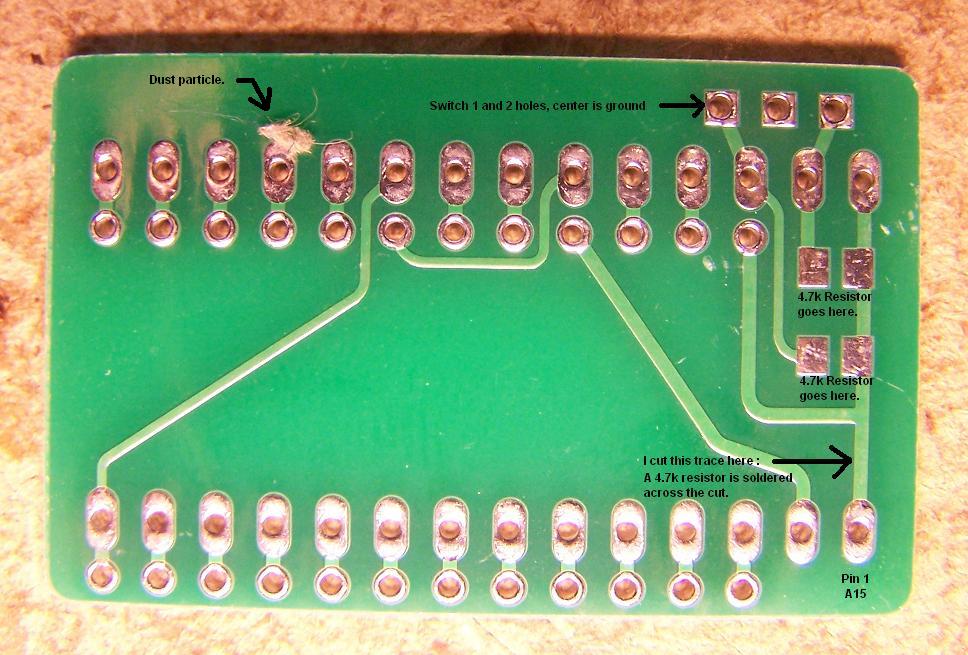 The other day I got an email from a gent in Italy wanting a 5 kernel adapter, MAX I've ever done was 4 using my C64 kernel 24 to 28 pin adapter boards using 2 switches. After some thought I decided to pull out all my notes, EPROM pin out sheets and a C64 kernel blank PCB. I looked those over for awhile and had an idea in mind to try, I made some notes of my ideas while they were fresh in my head because if I don't do that I get side tracked easily and forget what my idea was. Call it adult A.D.D or what ever you want LOL. When I got home from work I fired up the soldering iron to make the needed changes to the C64 kernel PCB that were needed to make a 27512 - 64K EPROM work in it. The original design was for a 27256 - 32K EPROM max. In order to access the higher banks of the 27512 EPROM I need to cut the trace to Pin 1 - (A15) on the PCB and then solder a pull up resistor (4.7k) across that same gap. The next thing was to connect a 3rd switch to allow access to those extra four 8k banks of ROM. With this setup I'm able to have 8 different Kernels on one EPROM.