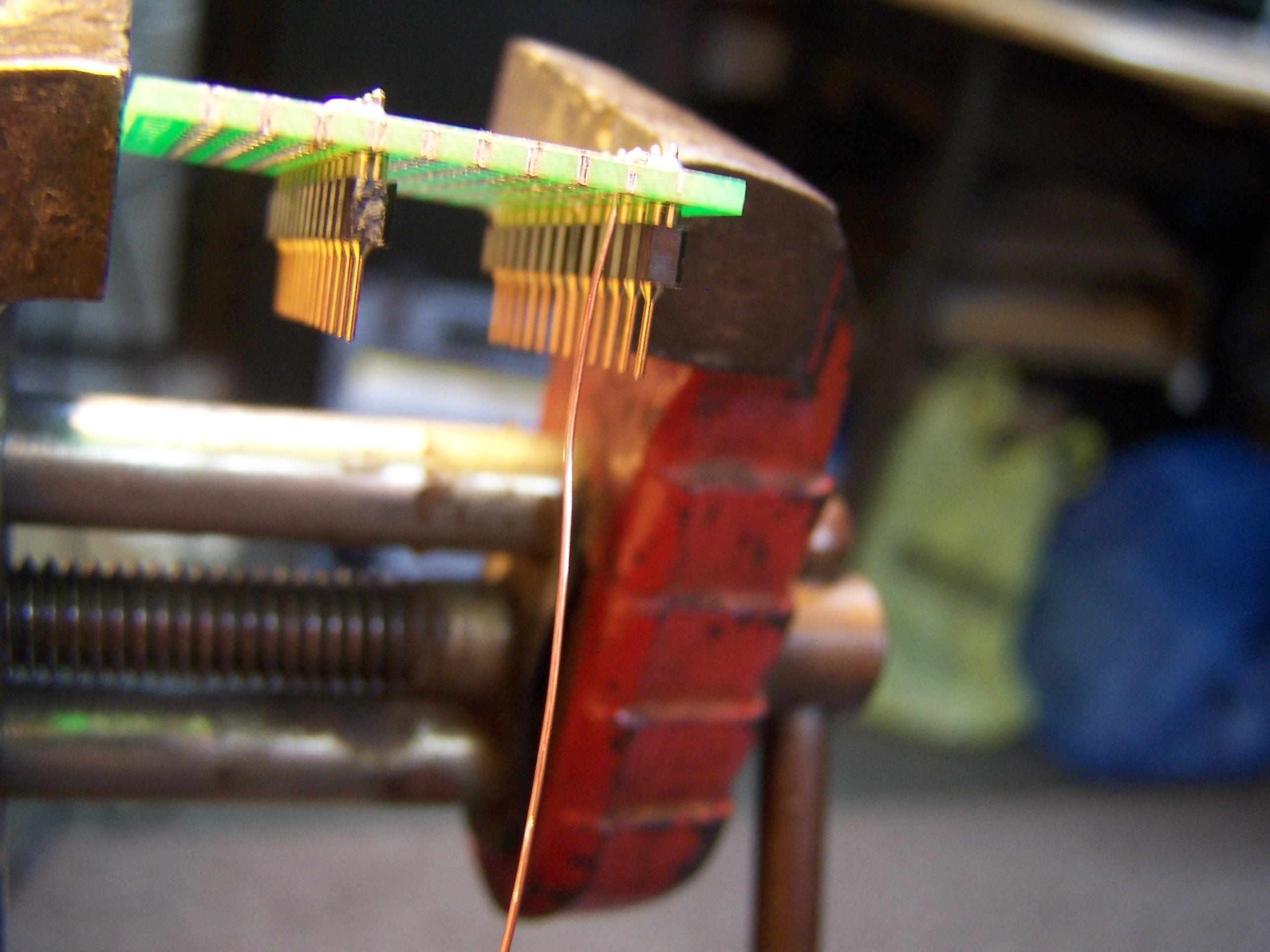 A friend of mine (goog on IRC) had told me he made a custom character ROM for his C64. I asked how and he told me he used a custom character set he created and an MCM68766 24 pin 8K EPROM. That EPROM has the exact same pinout as the original character ROM does. All I had on hand were a few AMD AM2732 24 pin 4K EPROMS. The pinouts are not the same. Pins 18 and 21 are different so you can't just drop one of these AMD EPROMS in after programming.... well you can BUT you will only see one character set and the other will be all screwed up, I know I tried it anyways. As the pins were different I needed to make some kind of adapter. I didn't want to use a stack of sockets to do what needed to be done. I decided to use one of the man thru hole circuit boards I purchased on eBay awhile back just for this type of project. They are a double sided type board. Next up was how to wire the board so the socket was wired to the pin headers. I decided to use some of that solid phone wire I had in the wire box. I also used one of those cheap sockets that has the real thin legs on them. I bent the wire in a small "L" shape with just enough length to go thru the hole next to each of the pin header legs and then snip it of on the back side of the board. What this did was allow the wire AND the leg from the IC socket to be in the SAME HOLE to make the connections after I soldered the socket in. It was a bit of a pain to solder 22 times like that BUT it worked and I'm happy with it. You can see from one of the pictures, the wire and the IC socket leg on the PCB that I later soldered. (Picture on the right) I would have soldered in the EPROM but at the time I didn't even know if it was going to work and only have a couple of the 4K eproms I really didn't have one to spare so to speak. When I tried it all the characters were screwed up, I almost tossed it in the trash. I looked at the pinouts and realized that Pin 18 on the EPROM shouldn't be connected (The Blue/Black wire connected to the Pin with the "R" ). I removed the wire and tested again, BINGO it worked and here is the Blog entry about it. :) Pin 21 on the EPROM is connected to the SOCKET Pin 18 that connects to the C64 main board.