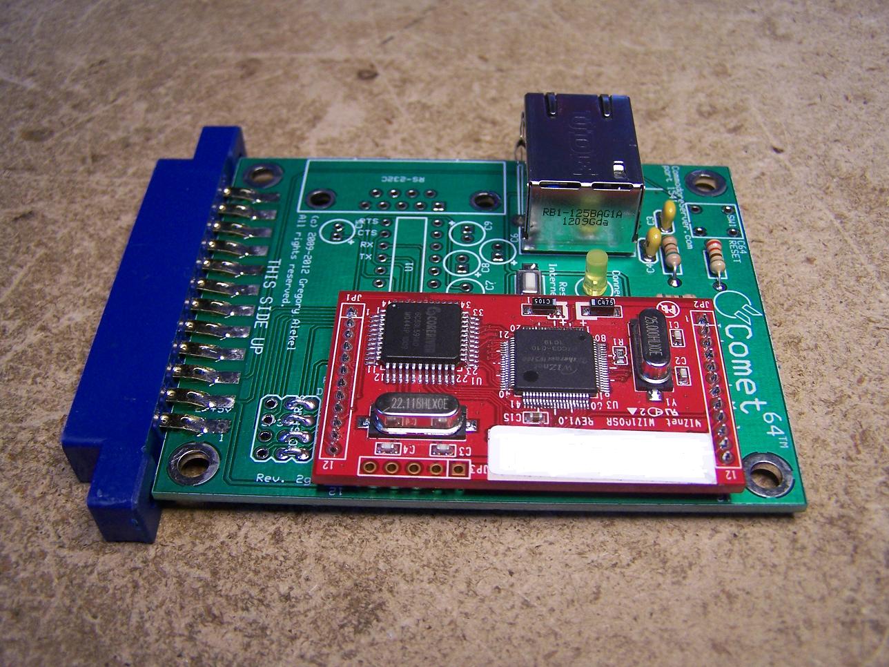 The next thing to do was to LOWER the Wiznet board so the case would close. First thing I did was remove the pin headers, that took a bit of work as I didn't want to destroy it. A new one was $22. after I did that, there were 6 resistors and 2 capacitors that needed to be moved but where..... AHH put them on the BOTTOM side of the board. After I did that the Wiznet board sat plenty low enough to close the case. What you see is the final product. I use the user port cable to connect the Comet to the computer, the cart case doesn't fit in the user port opening. Work perfect with no problems.