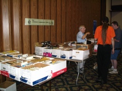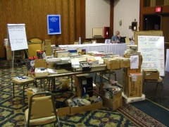 Exhibit hall. Open machines in front, demo tables at rear.