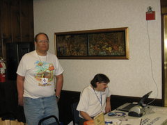 Jim Brain in checked shirt, Pelleas in striped shirt.