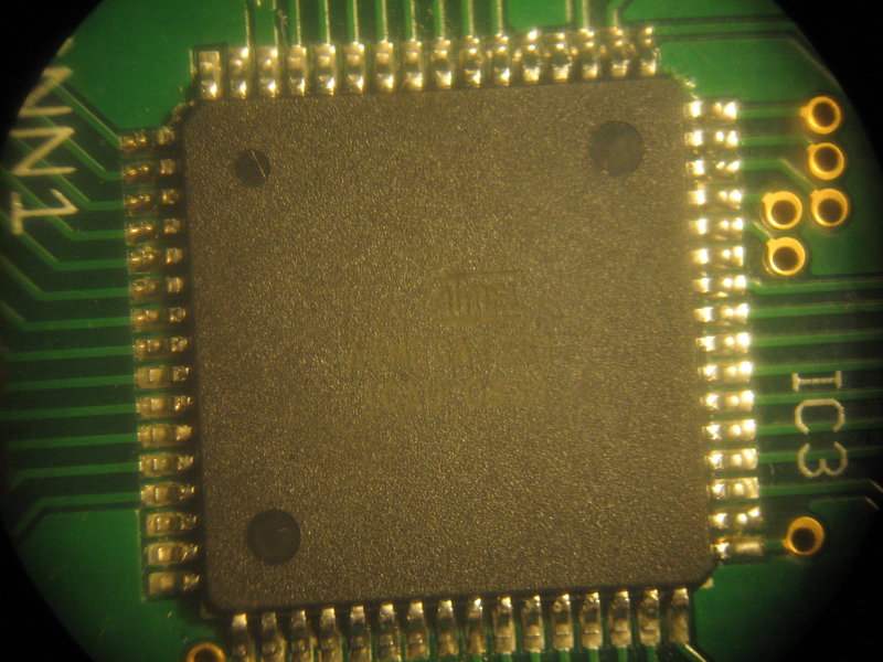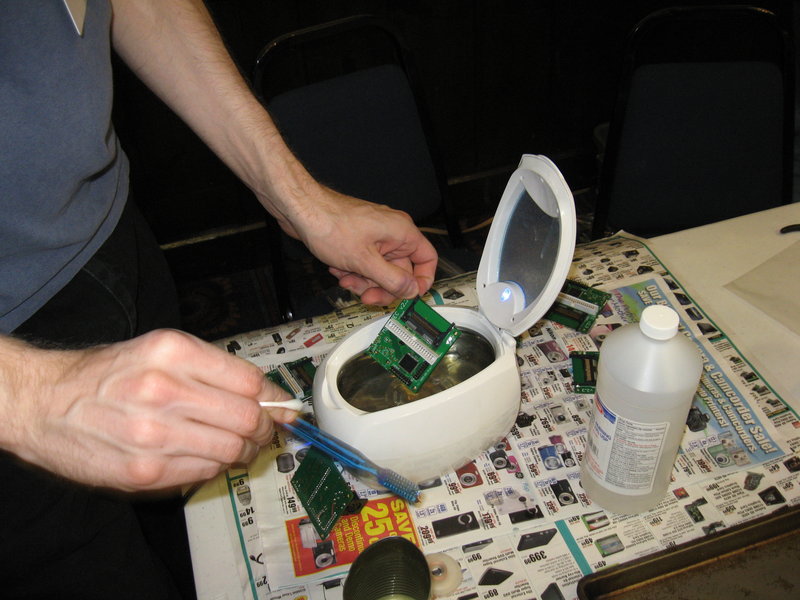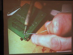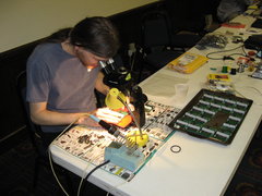 Eric soldering uIEC boards under a microscope. Note the cookie sheet