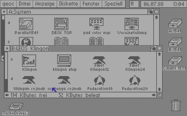 Here's something for Star Trek fans: A D64 image of a GEOS disk containing the Organian Peace Treaty as a geoWrite file... in Klingon (tlhIngan Hol). There's actually a Klingon font on this disk; there's also a nice geoPaint image of a Klingon ship. You can preview this disk on peekbot.