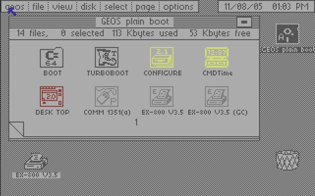 GEOS is a disk-based GUI operating system with proportional fonts for the Commodore 64, and was a remarkable achievement for its time (1986). It includes features still considered modern, like the ability to double-click a data file and have it load in its parent application regardless of name (i.e. no file extensions). In fact, you can rename the parent application and it will still be found (by its "permanent name string"). It also has extensive drag and drop capability (e.g. drag a data file to the printer icon to print it, to a disk icon to copy it, to the trashcan to delete it). Later enhancements made it possible to use RAM expanders, CPU accelerators, hard drives, and more. (The 1541 Ultimate works well with GEOS.) The only thing we're really missing currently is a disk driver for Jim Brain's uIEC boards. If you are interested in disassembling the GEOS turbo code and porting it to that device, there is a discussion group.